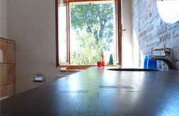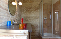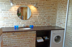 mit Natursteinmauern eingefasstes Badezimmer inkl. Waschmaschine.